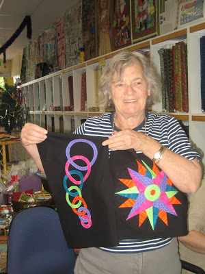 This is Jean's wallhanging.. She quilted it on her domestic machine - you should see the feathered borders! We've enjoyed watching Jean doing the blanket stitching by hand on Wednesdays (sometimes I think Jean comes up with projects especially to bring to sit and sew!!)
